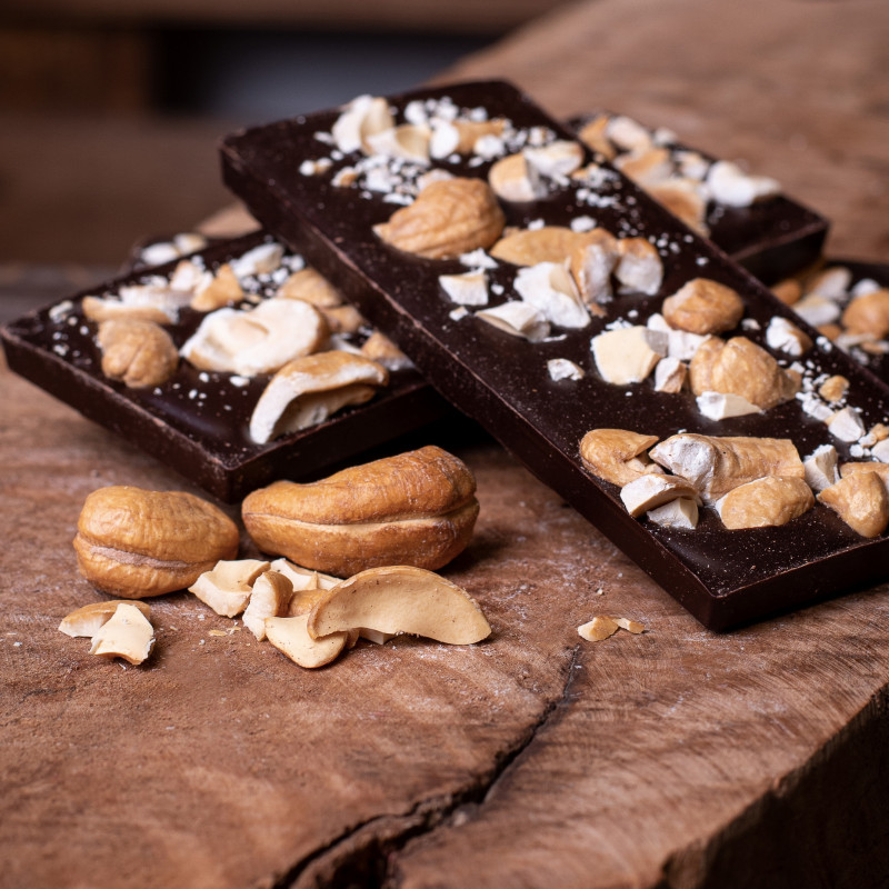 Delikátní chuť poloslaných kešu a hořké čokolády.