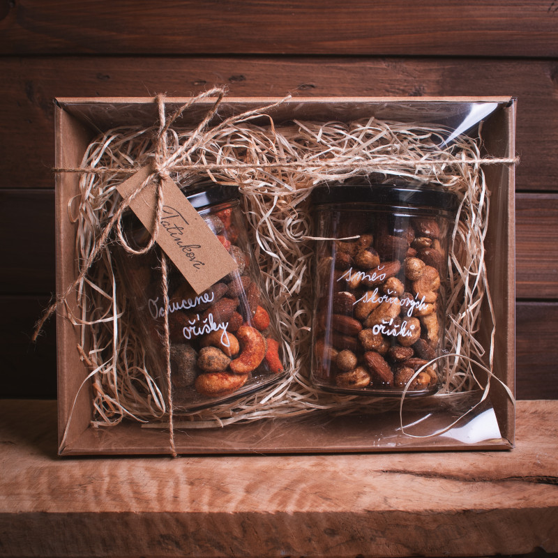 V krabičce naleznete pražené ochucené oříšky všech chutí a jemně sladké skořicové oříšky.